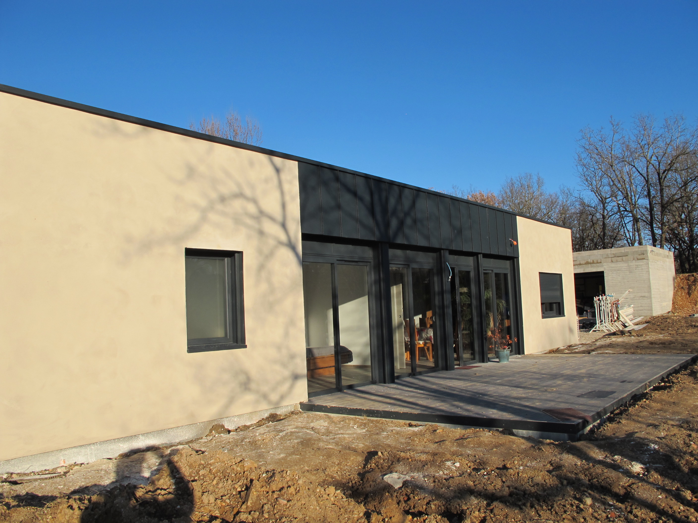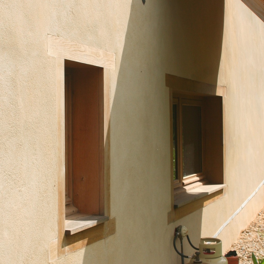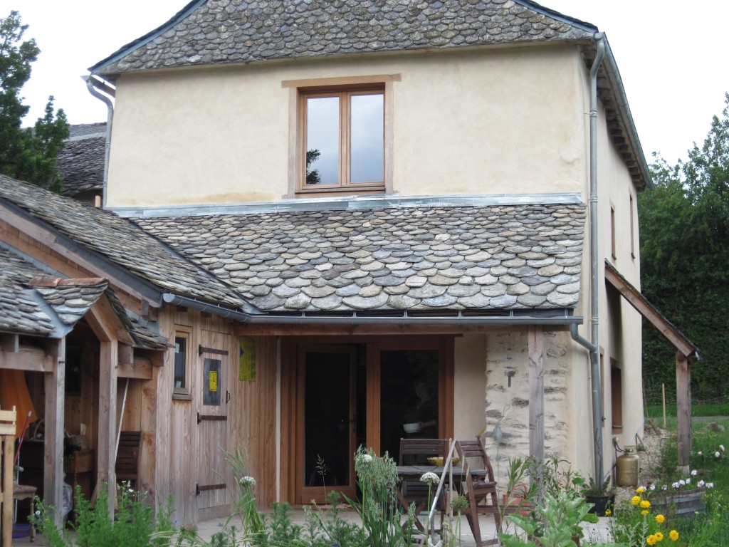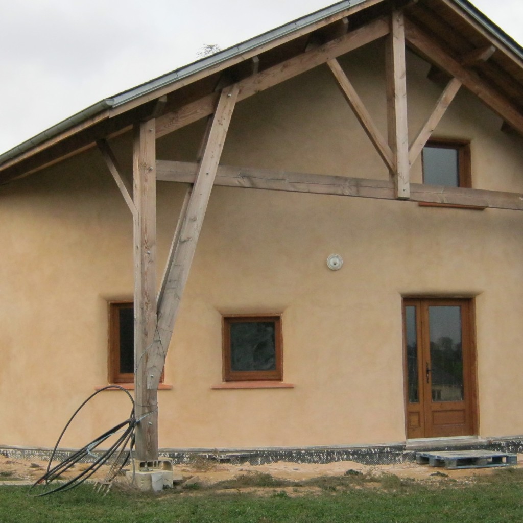 Enduits chaux aérienne sur maison poteaux bois et remplissage paille – construction Les Bois de Paille (Lévezou Aveyron)